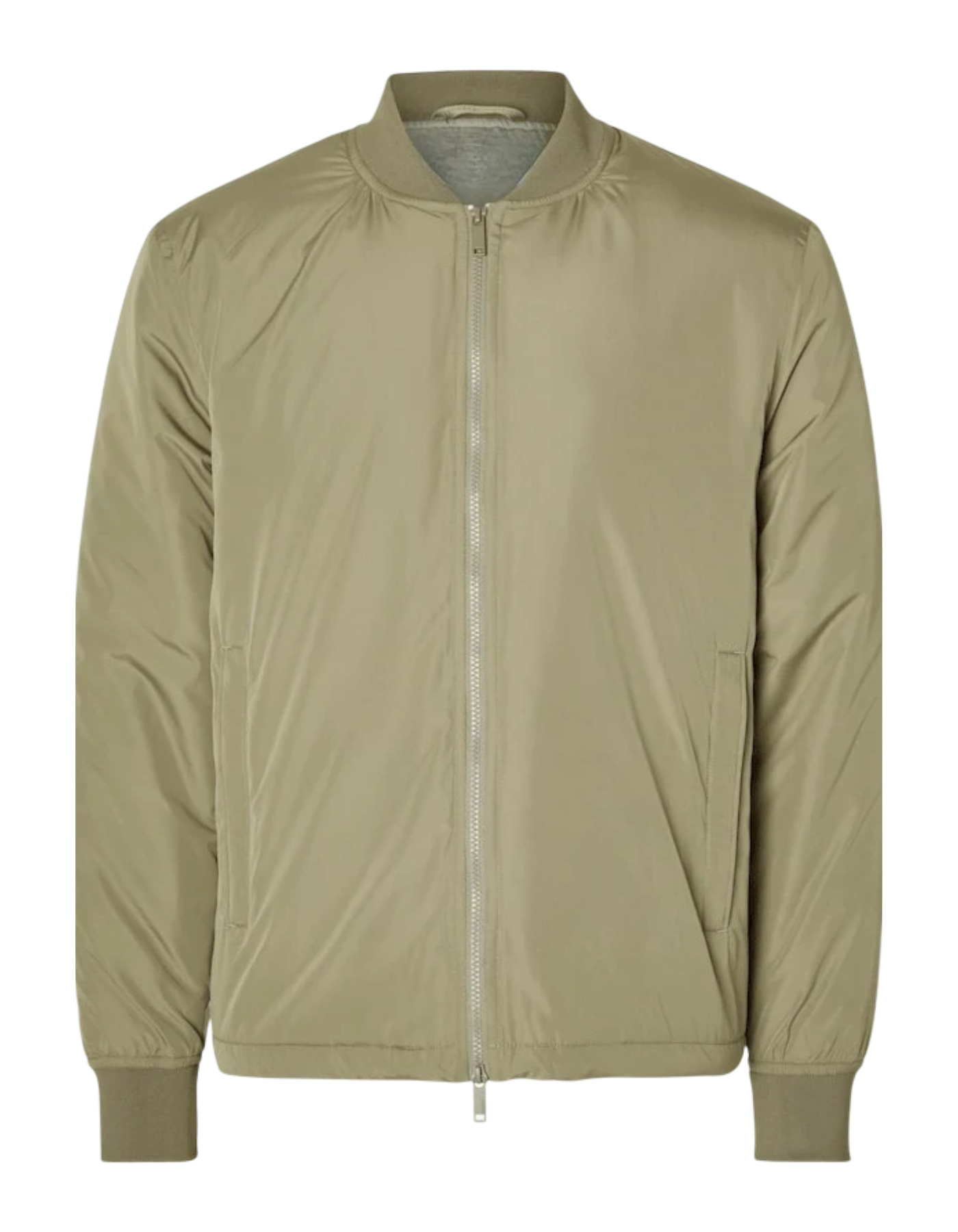 This bomber jacket is made from durable nylon or polyester. It’s lightweight, wind-resistant, and perfect for daily wear. The ribbed cuffs, collar, and hem offer a snug fit. A full front zipper and side pockets complete the look. The khaki color gives it a clean and bold military vibe.